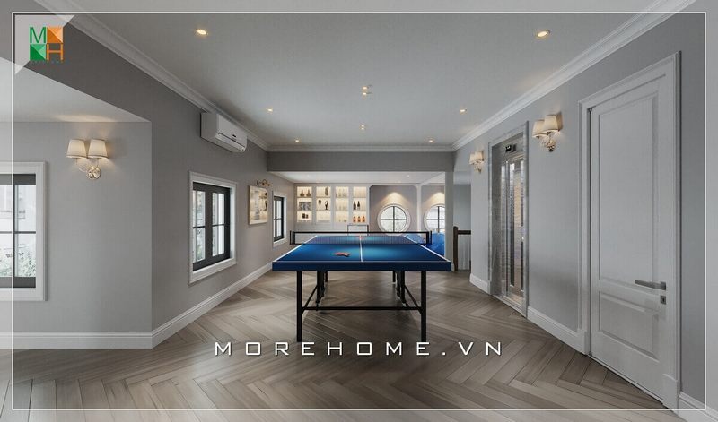 Khu chơi thể thao, tập luyện bóng bàn và các hoạt động thể dục nâng cao sức khỏe được quan tâm bố trí trong một không gian thoáng có nhiều cửa sổ của biệt thự