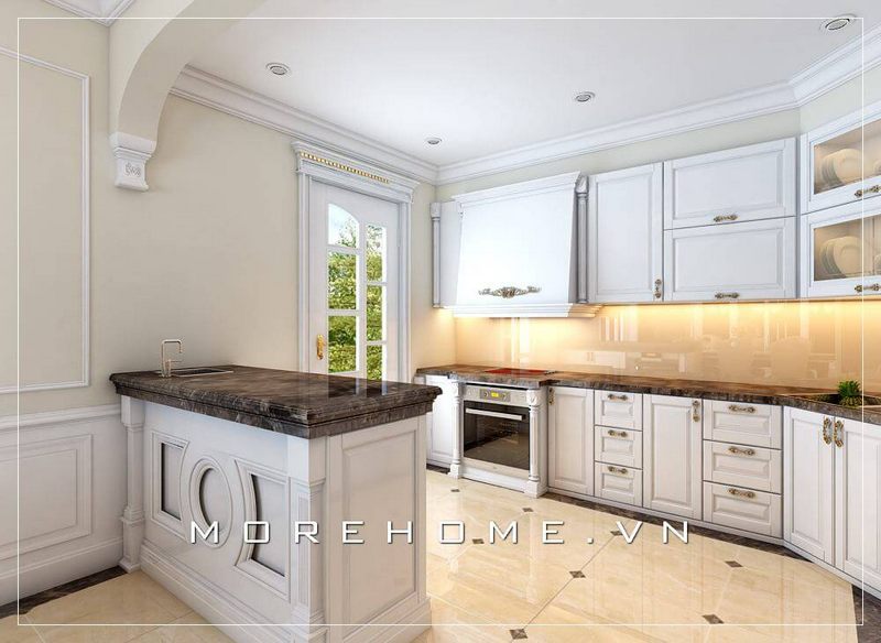 Thiết kế nội thất phòng bếp tân cổ điển sử dụng tone màu trắng chủ đạo tạo nên không gian sạch sẽ và sàng trọng cho nhà biệt thự