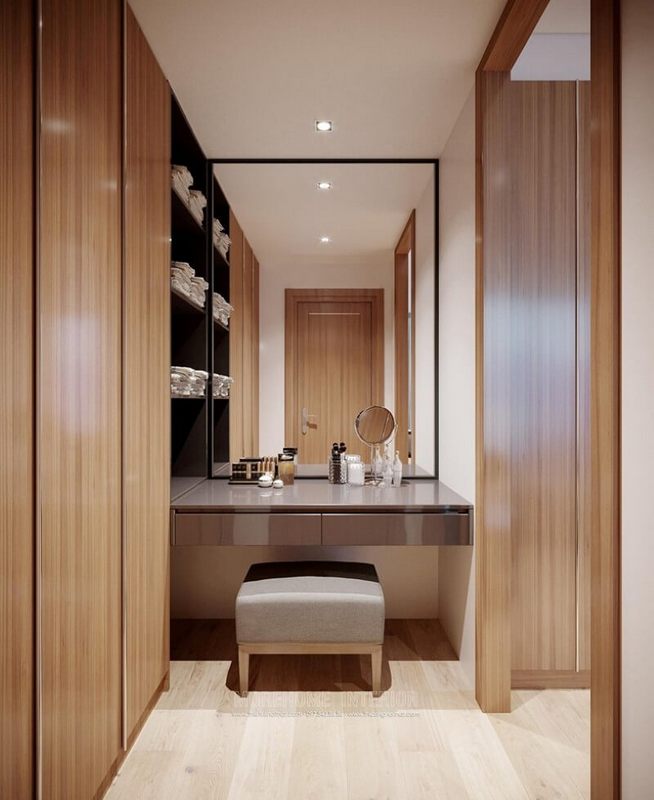 Không đơn thuần chỉ là một căn phòng để đồ đơn điệu của căn hộ chung cư, nhà phố, biệt thự mà nhà thiết kế rất sáng tạo khi thiết kế hai tủ đồ gỗ cánh kính hiện đại hai bên tường, vừa tận dụng được không gian mà còn thể hiện tính thẩm mỹ cao.