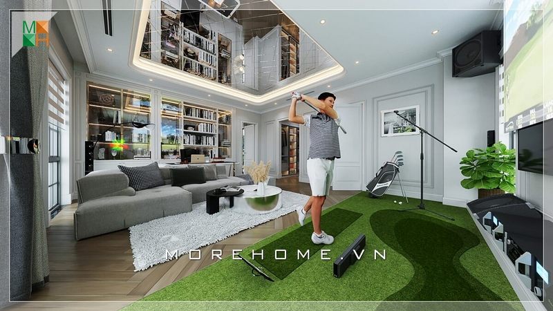 Nội thất phòng khách được bố trí độc đáo thoáng đãng với điểm nhấn là sofa vải êm ái mới lạ cùng sân golf nhỏ là lựa chọn hoàn hảo cho căn hộ chung cư thông tầng.
