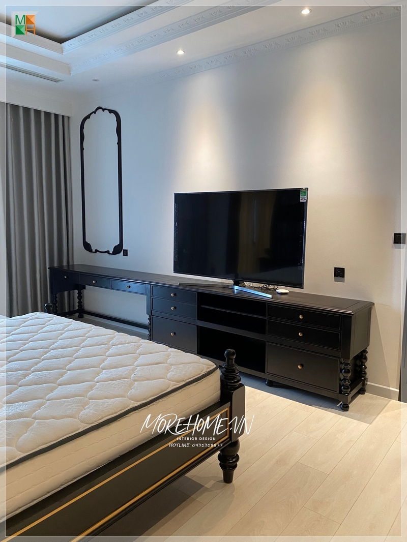 Thi công nội thất phòng ngủ theo phong cách Indochine để phục vụ nhu cầu sử dụng hằng ngày của gia chủ, tạo nên một không gian sống thoải mái và đầy tính cá nhân hóa.